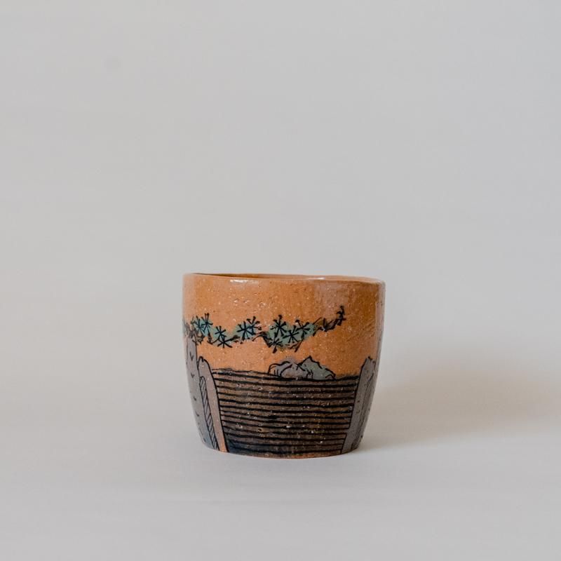 ざらっとした荒土の表面に、脇山さんが描く山水が絶妙な表情を生み出しています。