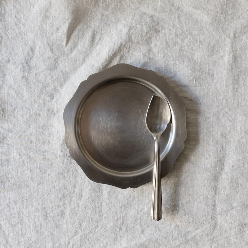 猿山修さんがデザインを行い、新潟県燕市の田三金属がプレス加工したものに、竹俣さんが古色仕上げを施しています。