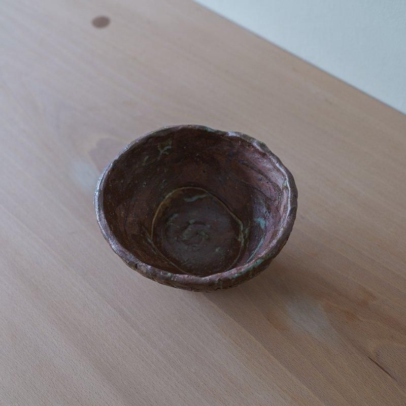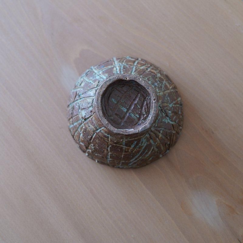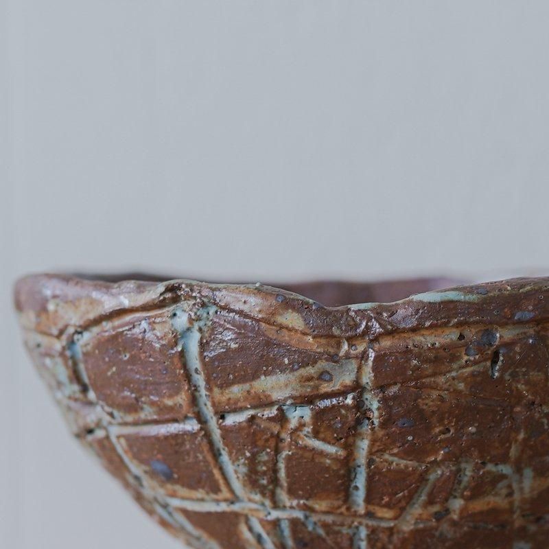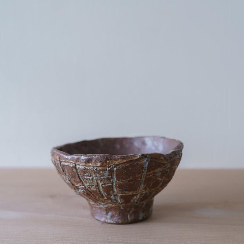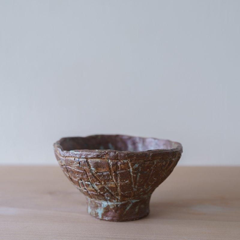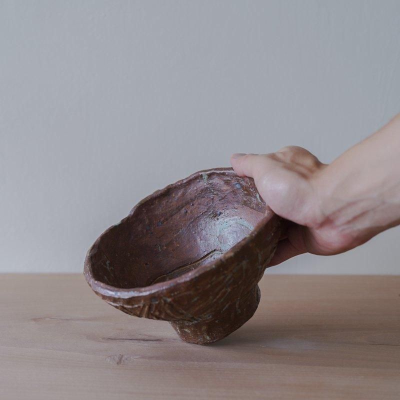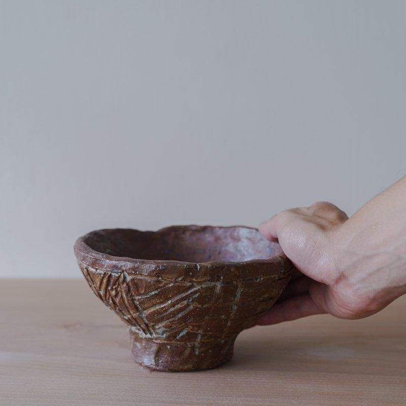 ろくろを使わずに手捻りで作られたこちらのお碗は、手の跡やゴツゴツした感じが強い存在感を放っており、ひときわ目を引きます。