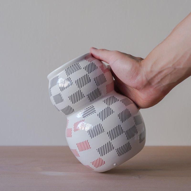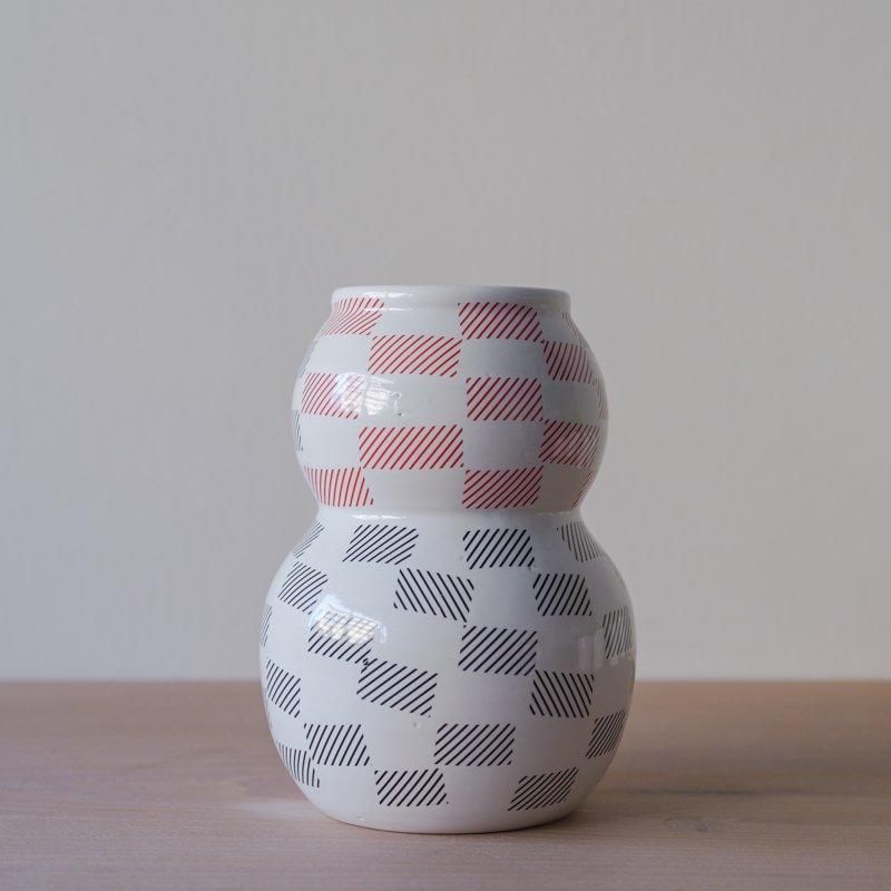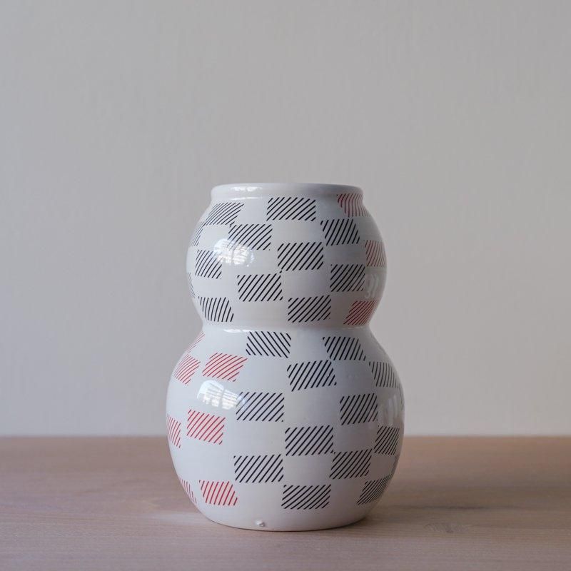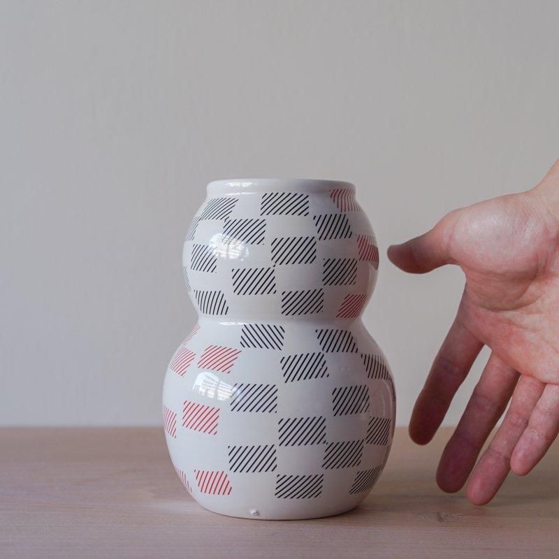 マスキングテープを思わせる柄が豊かな表情を生み出している、オブジェのようなフラワーベース。