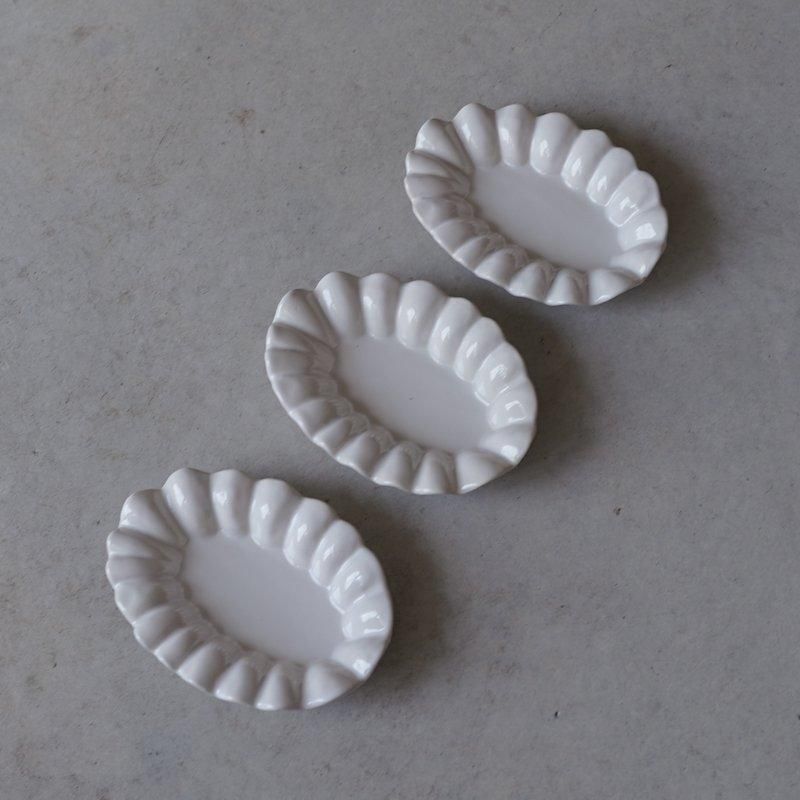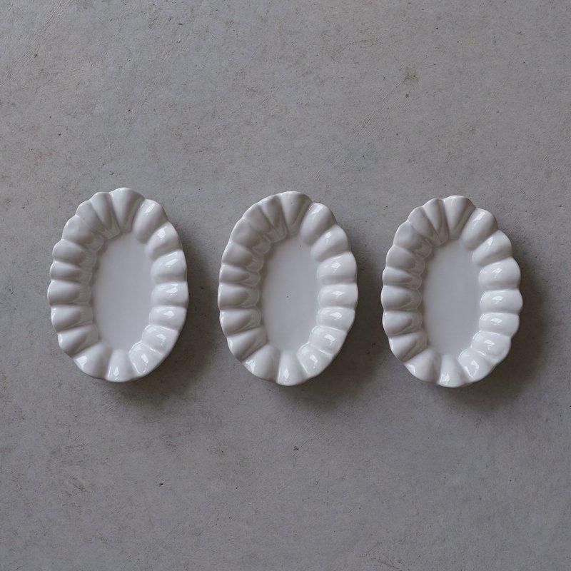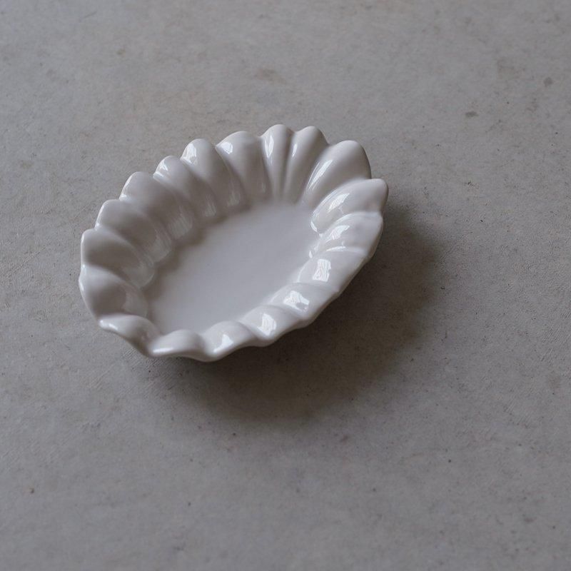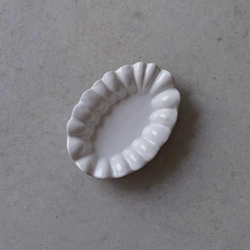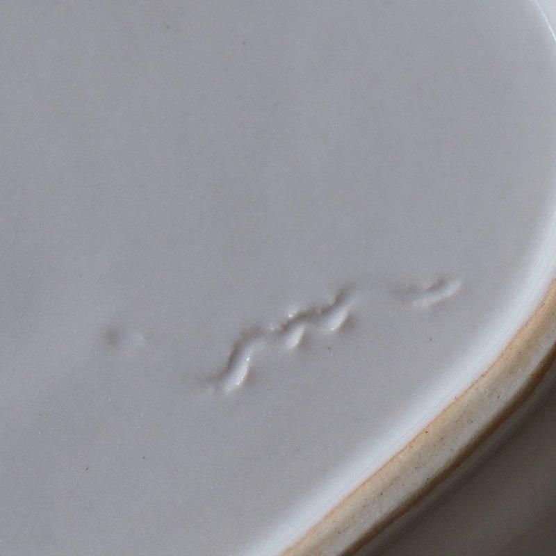 たわみのあるフォルムと柔らかいニュアンスのある白の釉薬が、アンテイークのような佇まい。古いものや伝統へのリスペクトと今を生きる作家の感性が、上手に融合しています。静かな個性が感じられる作品です。