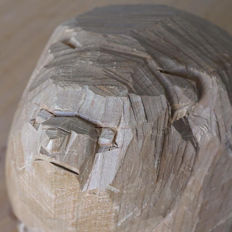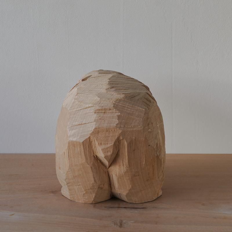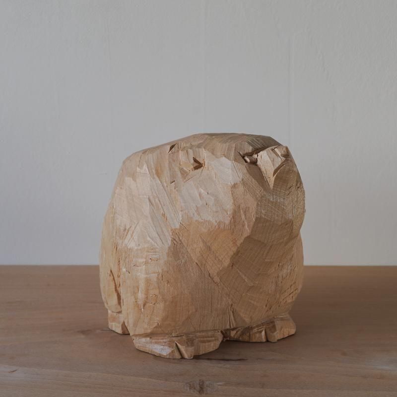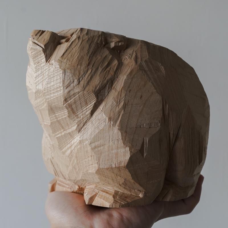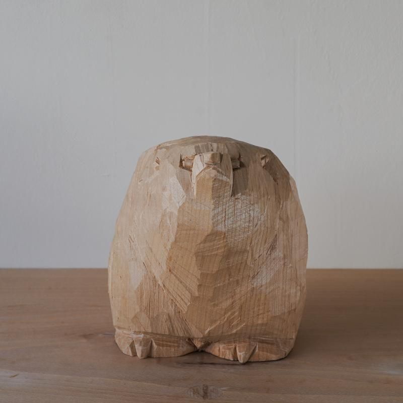 前回紹介した作品たちよりもファットでずっしりとしたフォルム。背中から肩にかけての手斧(マサカリ)によるゴツゴツした彫り跡は山の岩肌のようで、丸みのあるフォルムとのメリハリが効いています。