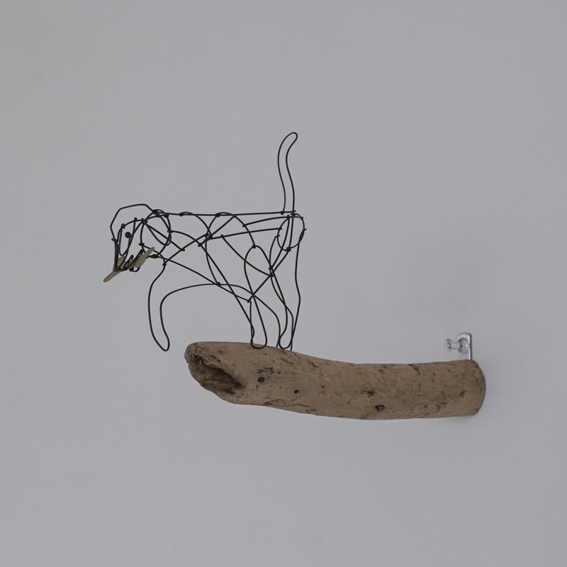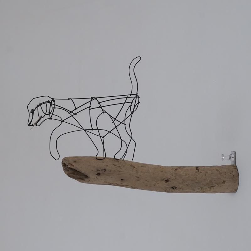 福岡在住のワイヤーアーティスト・山田一成さんの「よくばりなジョン(骨をくわえた犬)」という作品です。