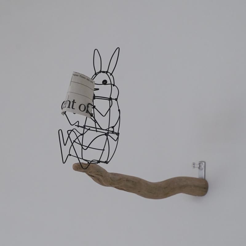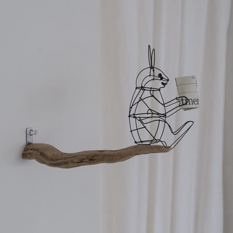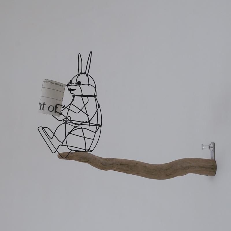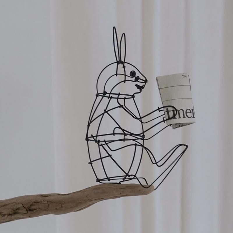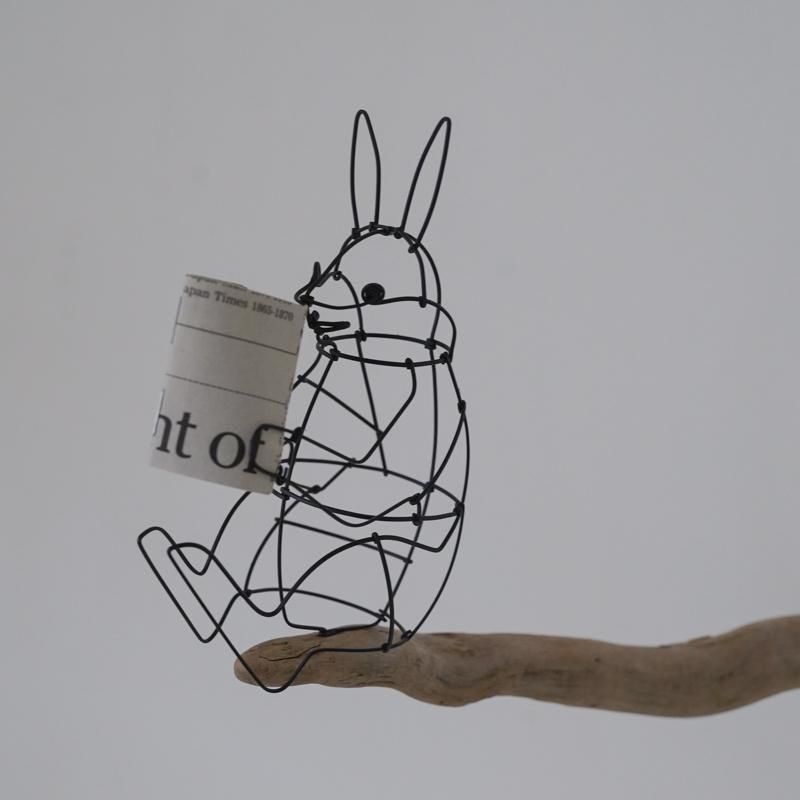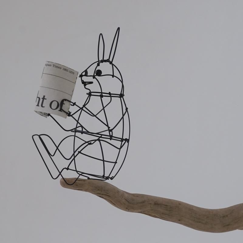 福岡在住のワイヤーアーティスト・山田一成さんの「木漏れ日の下で(木の上で本を読むうさぎ)」という作品です。