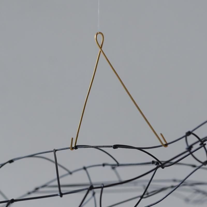 こちらの作品は吊り下げ用のフックが付属しています。画像のように、フックをかける位置によって傾き加減が変わり、見え方にも変化が生まれます。天井から吊るしたり壁に掛けてお楽しみください。